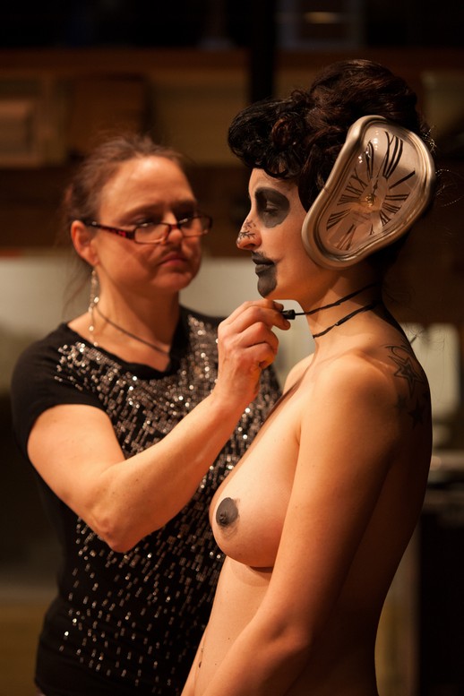 Von 19-21 Uhr gestaltete ich die Haut von zwei jungen Mädchen mit typischen Motiven des Künstlers: weiche Uhren, Ameisen, amorphen Wesen, Augen,Krücken, Dalis Bart, Totenkopf, Mauerwerk und natürlich Penissen verschiedener Ausführung. Es war intensiv und wurde vervollständigt durch das Haarstyling von Beatrice Kober.