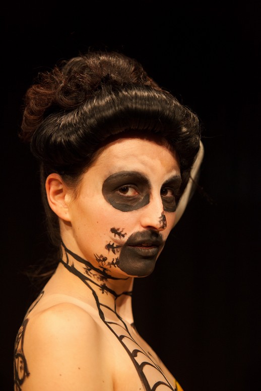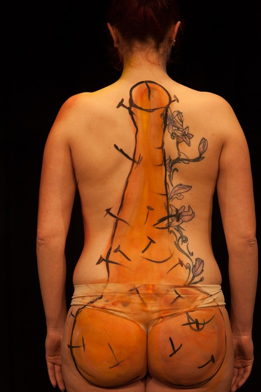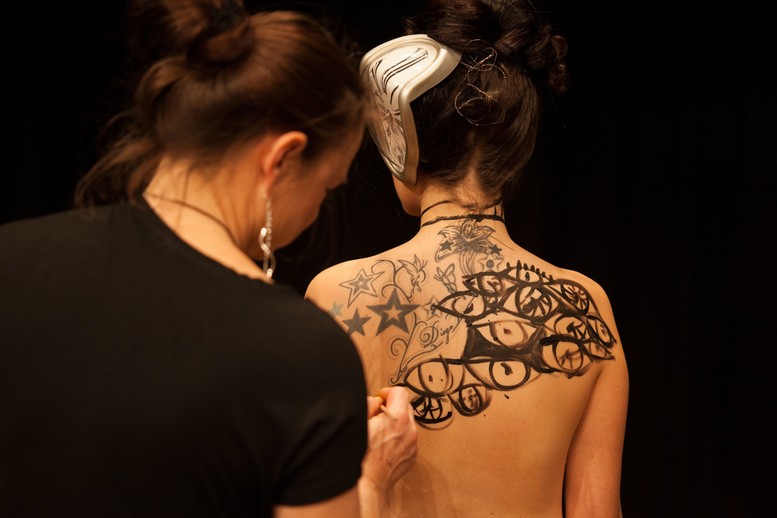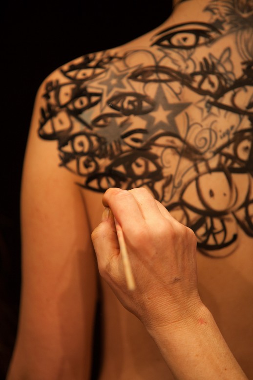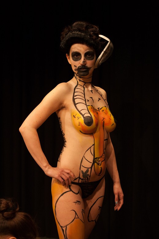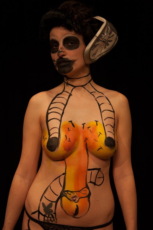 Von 19-21 Uhr gestaltete ich die Haut von zwei jungen Mädchen mit typischen Motiven des Künstlers: weiche Uhren, Ameisen, amorphen Wesen, Augen,Krücken, Dalis Bart, Totenkopf, Mauerwerk und natürlich Penissen verschiedener Ausführung. Es war intensiv und wurde vervollständigt durch das Haarstyling von Beatrice Kober.